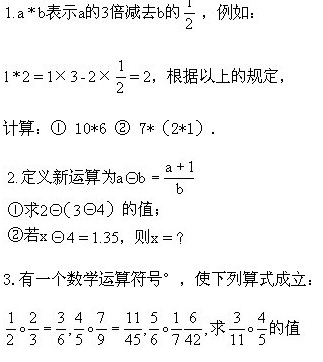 定义新运算通常是用特殊的符号表示特定的运算意义。它的符号不同于课本上明确定义或已经约定的符号,例如“+、-、×、÷、、>、<”等。表示运算意义的表达式,通常是使用四则运算符号,例如a☆b=3a-3b,新运算使用的符号是☆,而等号右边表示新运算意义的则是四则运算符号。