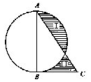 4、如右图,直角三角形ABC中,AB是圆的直径,且AB=20厘米,如果阴影(Ⅰ)的面积比阴影(Ⅱ)的面积大7平方厘米,求BC长。